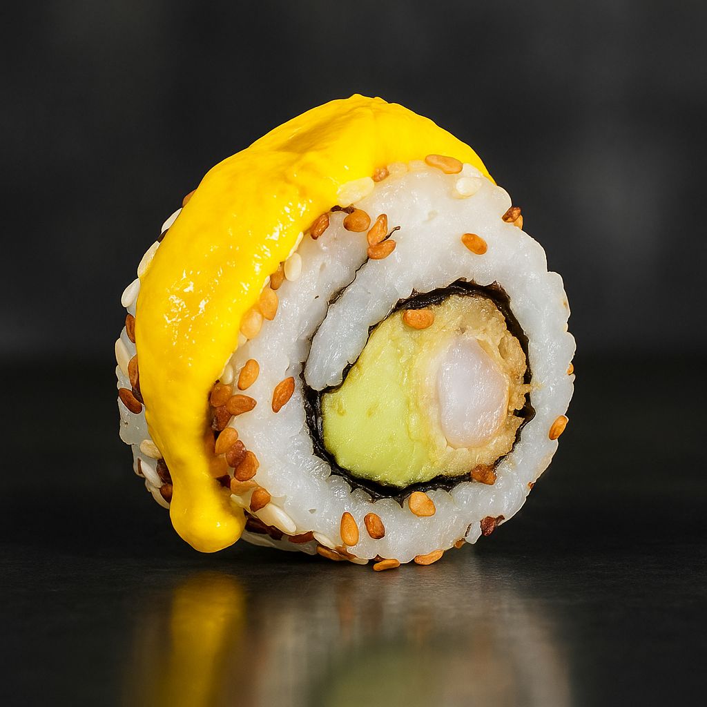 Garnelenfurai, Avocado, in Sesammischung eingewickelt, mit Teriyakisauce garniert.