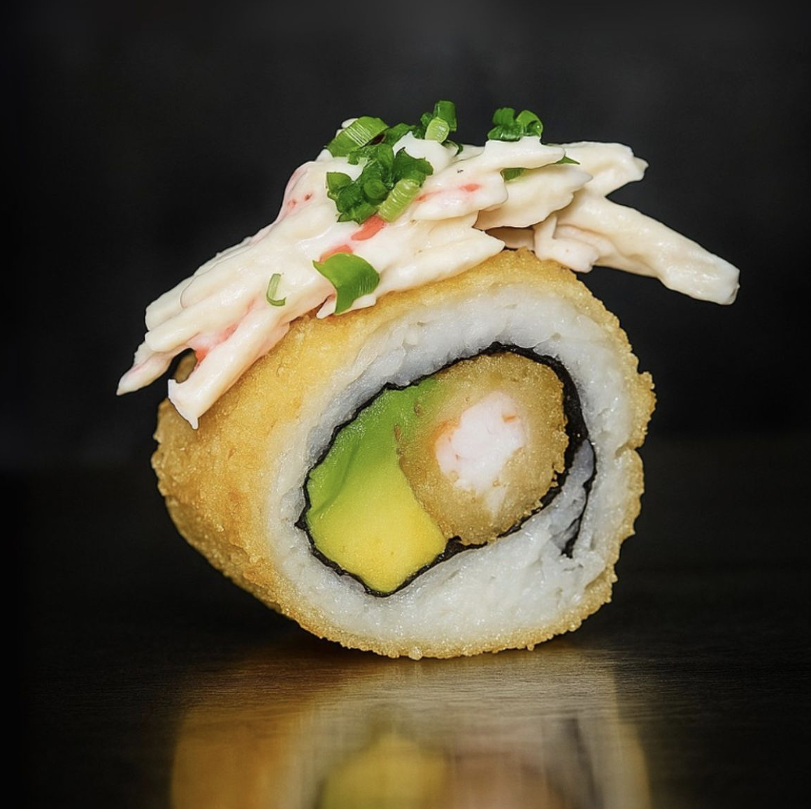 Garnelenfurai, Avocado, in Panko gewickelt, garniert mit Kani-Tartar in geräucherter Acevichada und Schnittlauch.