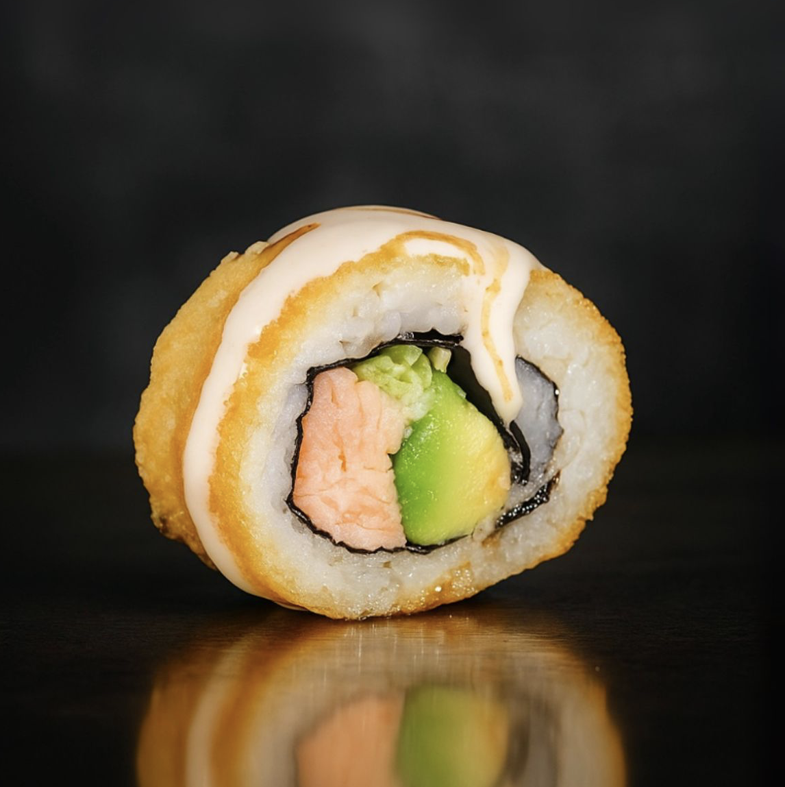 Lachs, Avocado und Schnittlauch, in Panko eingewickelt, mit rauchigem Ceviche und Teriyaki-Sauce garniert.