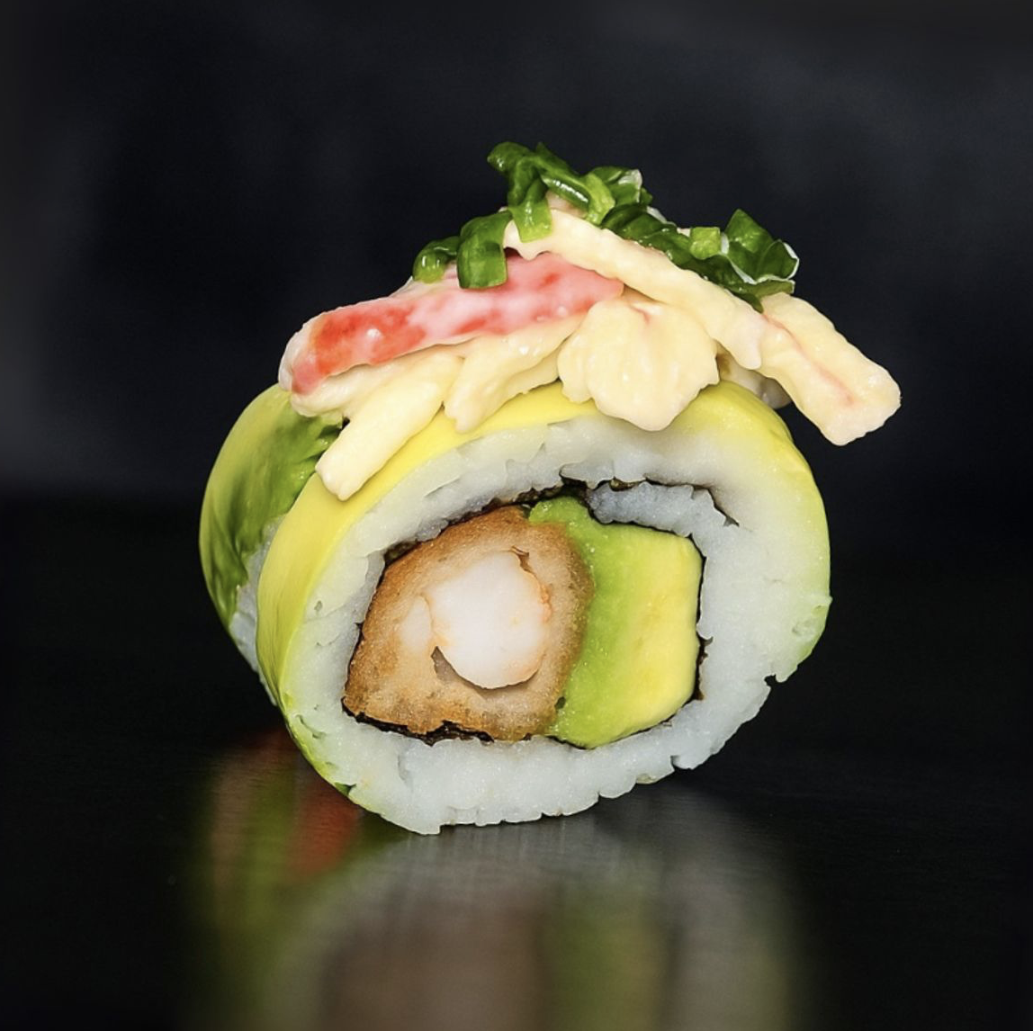 Garnelenfurai, Avocado, in Avocado eingewickelt, garniert mit Kani-Tartar in einer rauchigen Ceviche-Sauce und Schnittlauch.