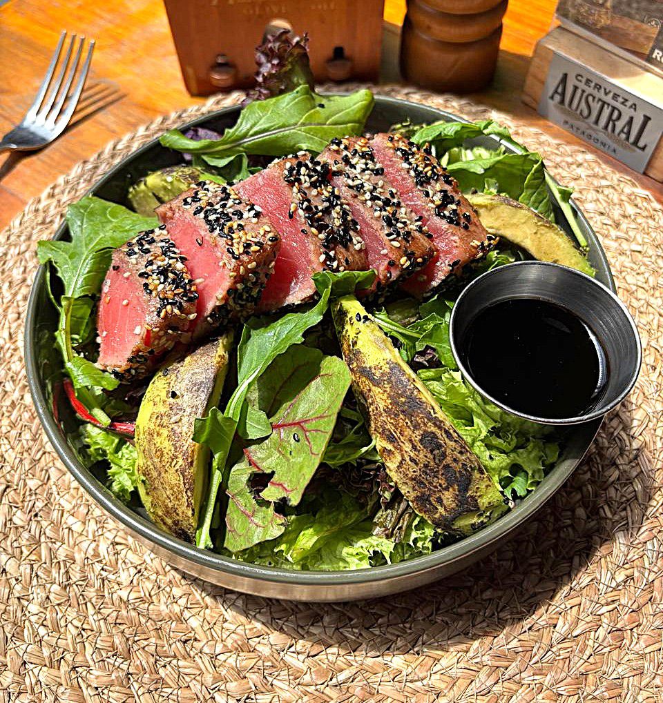Atún fresco (220g) sellado a la inglesa con sésamo tostado, sobre mix verdes, palta y aderezo de Miel Soya.