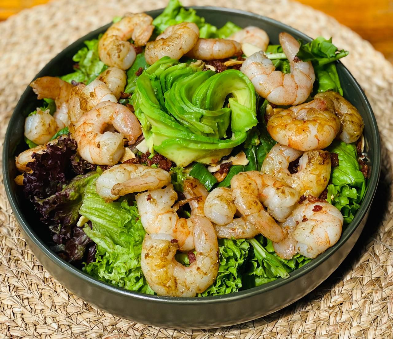 Mix de verdes 10 und camarones salteados, palta, almendras tostadas, crocante de tocino.