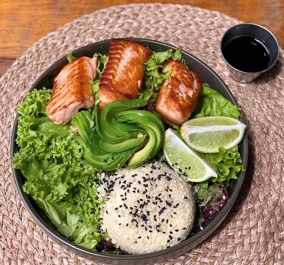 Salmón (200g) sellado a la inglesa con una cama de mix verdes , palta, acompañado con un timbal de cous-cous, Semillas de Sésamo y salsa miel soya.