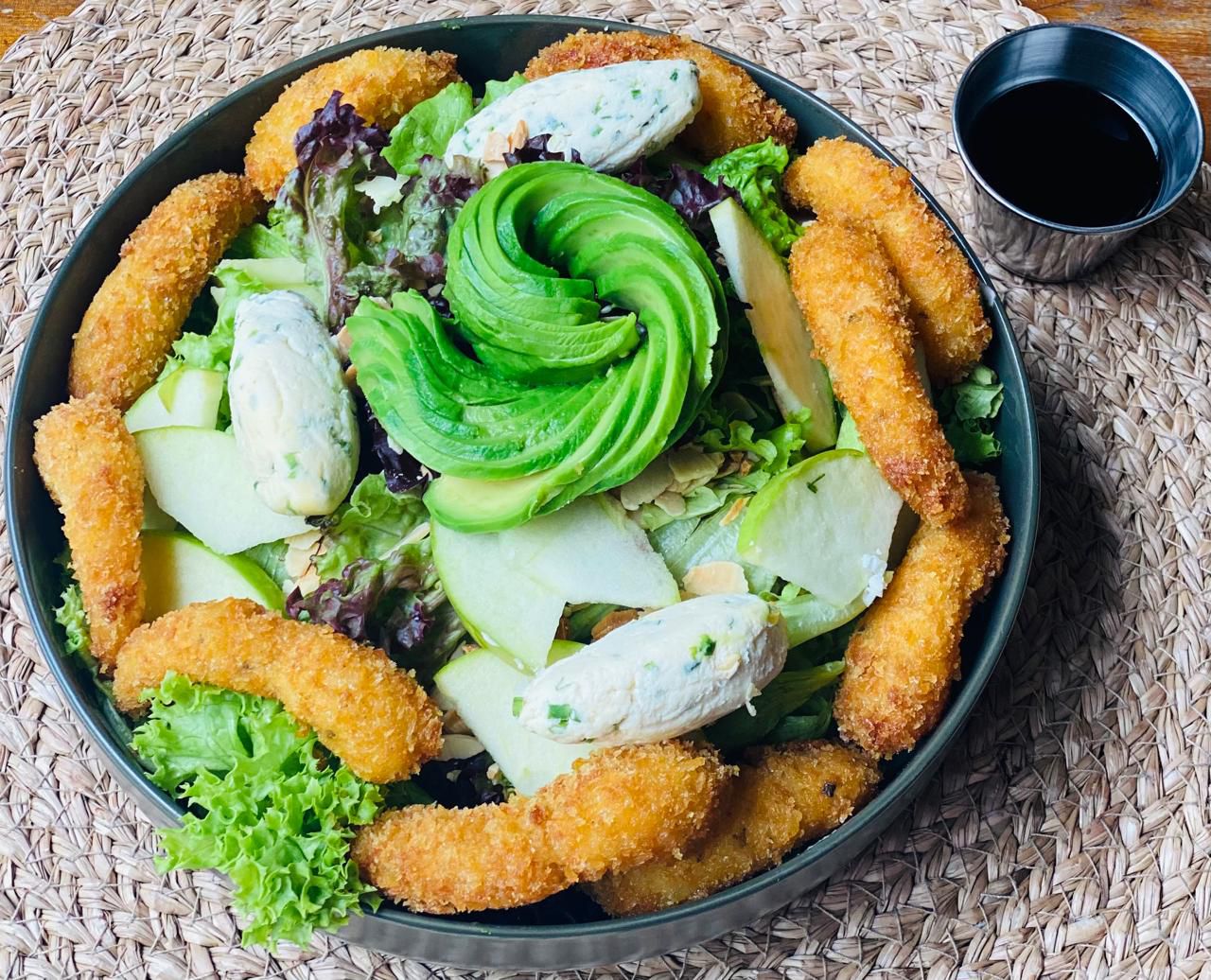 Excelente combinación de texturas y sabores en una ensalada hecha con mix verdes , palta con nuestros clásicos camarones apanados; quenelle de ricotta de la casa con ciboulette , manzana verde y almendras tostadas con un aderezo de miel soya
