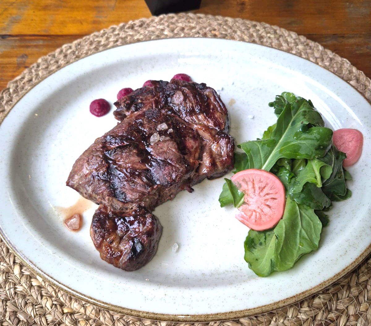 Corte de carne (350g) a la parrilla, con acompañamiento incluido.