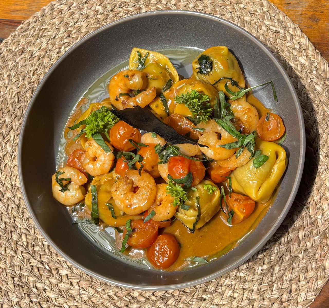 Agnollotti relleno de ricota, espinaca y nueces, con camarones, tomate, albahaca y mantequilla