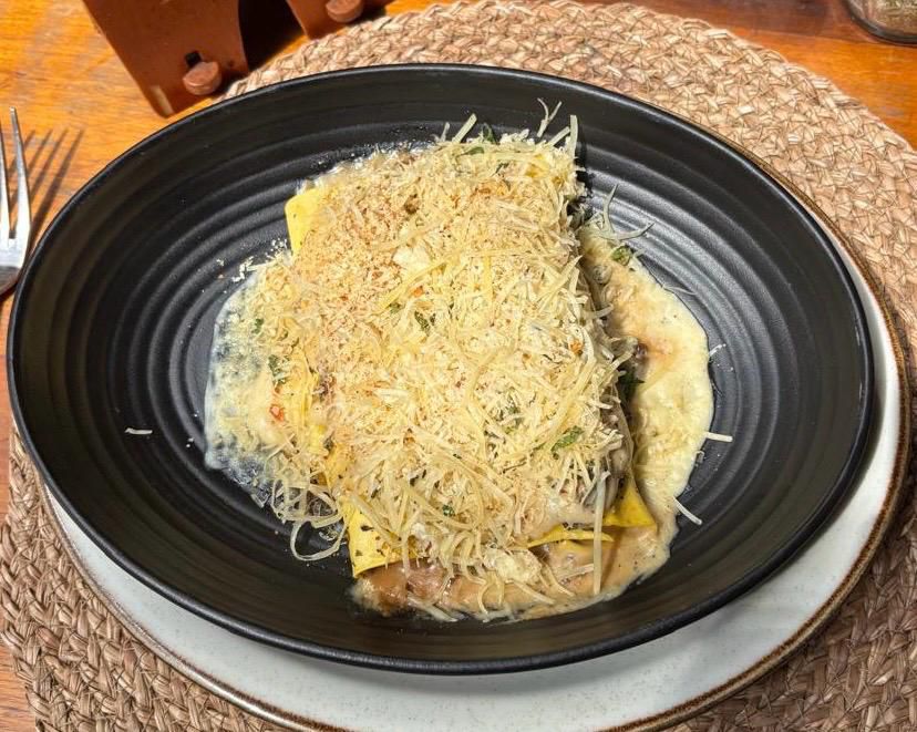 Canelón relleno de osobuco y queso crema, al horno con salsa funghi porcini y queso parmesano condimentado con un toque de merkén.