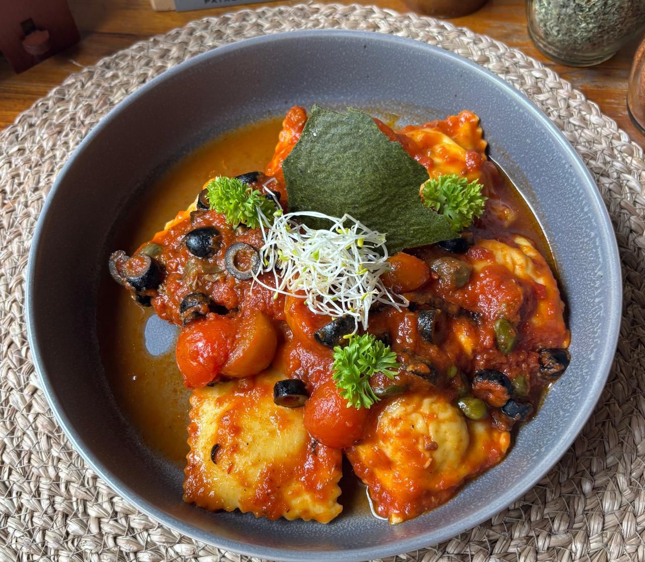 Ravioli relleno de plateada y ricota, con salsa a base de tomate, aceituna, tomate cherry, alcaparra, ají cacho de cabra, ajo y anchoas.