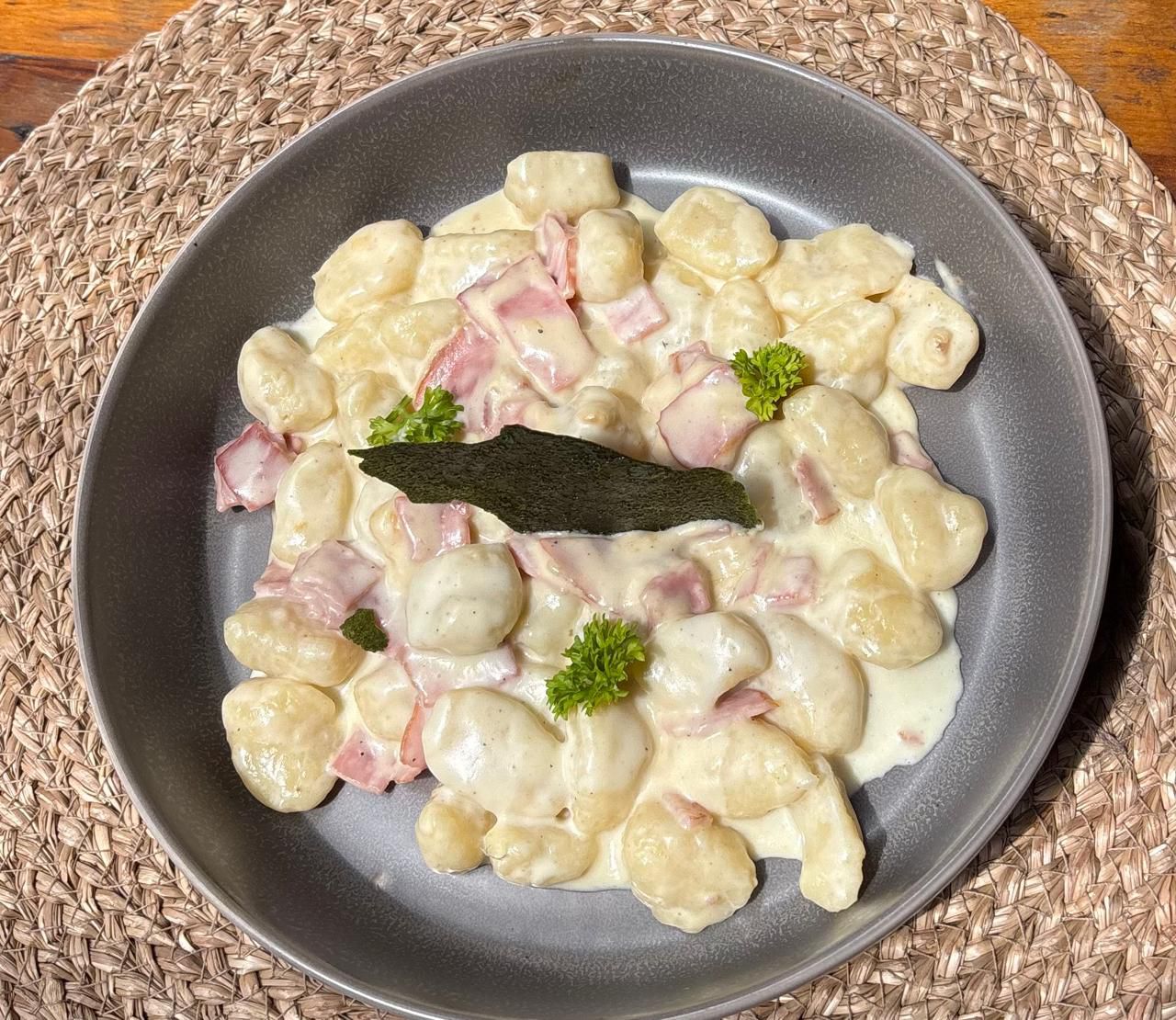 Gnocchi de papa con reducción de crema y jamón.