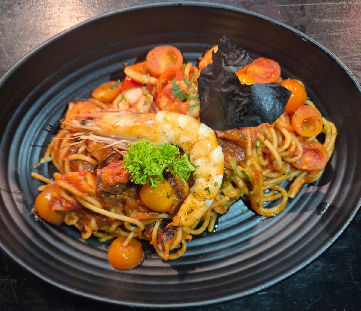 Spaghetti con base de pomodoro, pulpo, camarones y calamar con un toque de la casa.