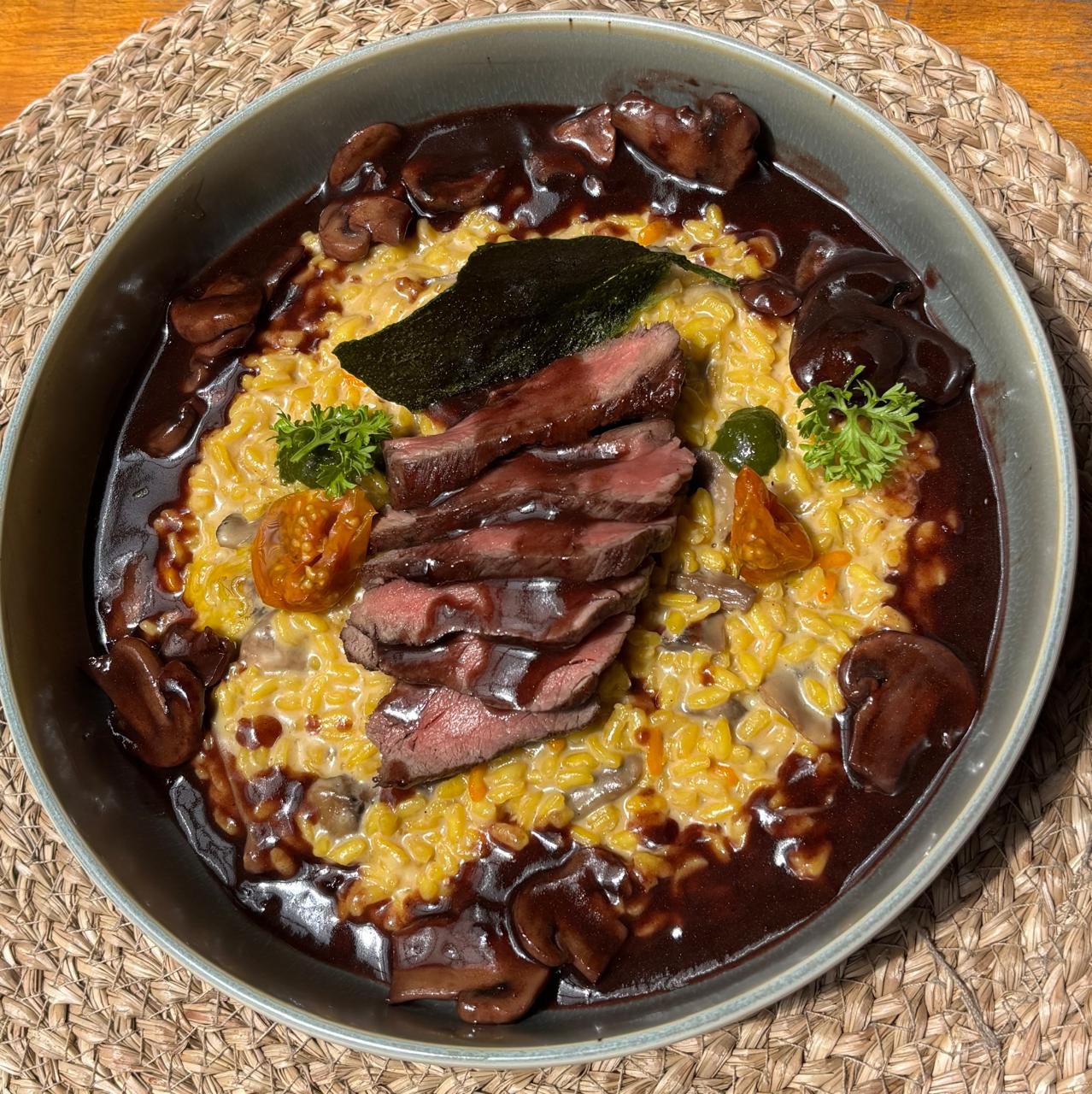 Risotto fungui 90g de filete en su punto un toque de crema y champiñones salteados.