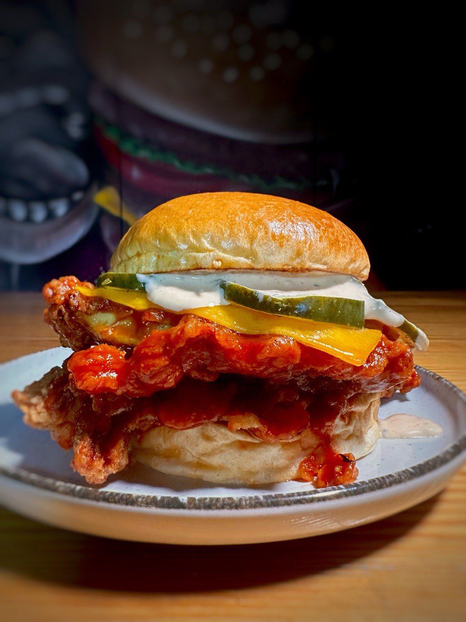 Pollo Frito al estilo Koreano (baƱado en salsa BBQ Koreana) con un toque picante, Cheddar lonchas, Pepinillo encurtido casero y Mayonesa American burger.
