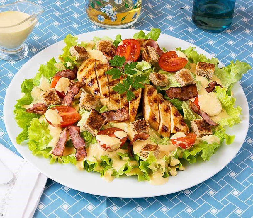 Mixed salad, cherry cream, Caesar sauce, crispy chicken, bacon and parmesan.