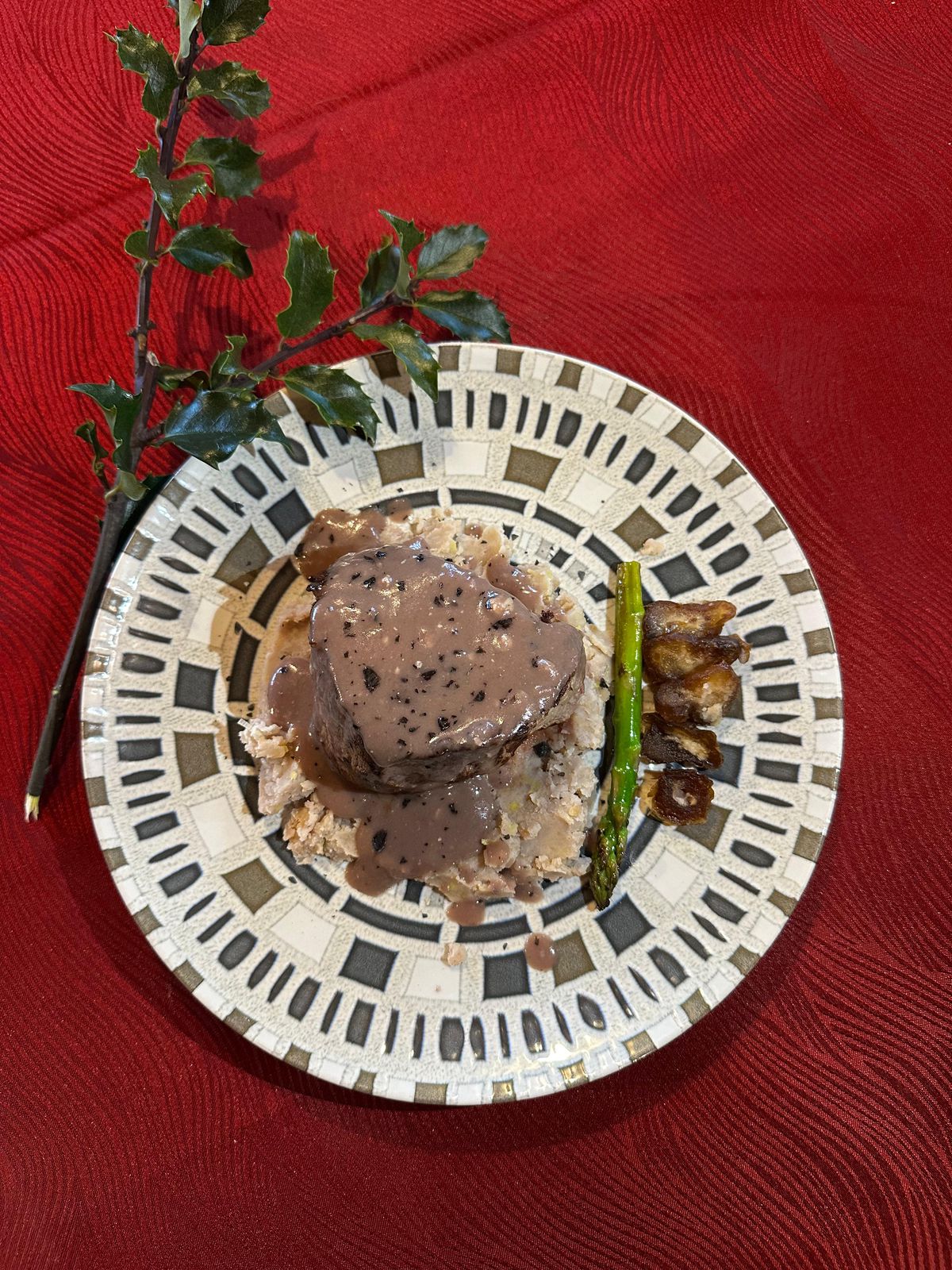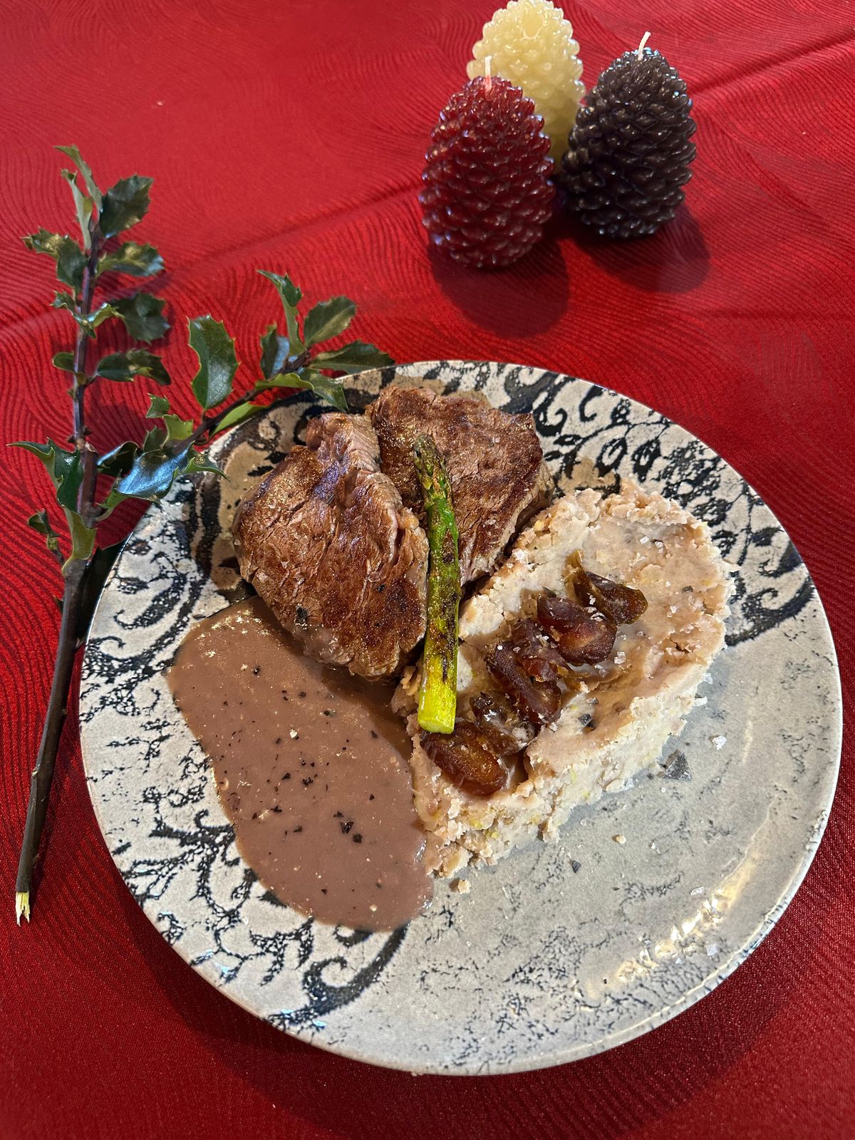 Sirloin steak from mature beef, on chestnut purée with Stilton sauce reduced to port wine