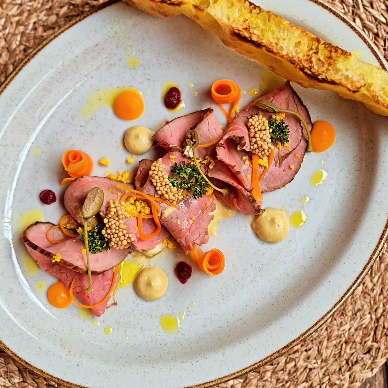 Su delicada preparación con carne de vacuna, vino blanco y especies mixta acompañada de su salsa Tonnato (atún)