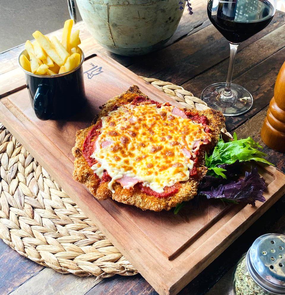 Milanesa de pollo (250gr), con base de pomodoro y una cama de jamón y mozzarella. Acompañamiento a elección (arroz blanco, pure de papas, papas fritas o mix verde).