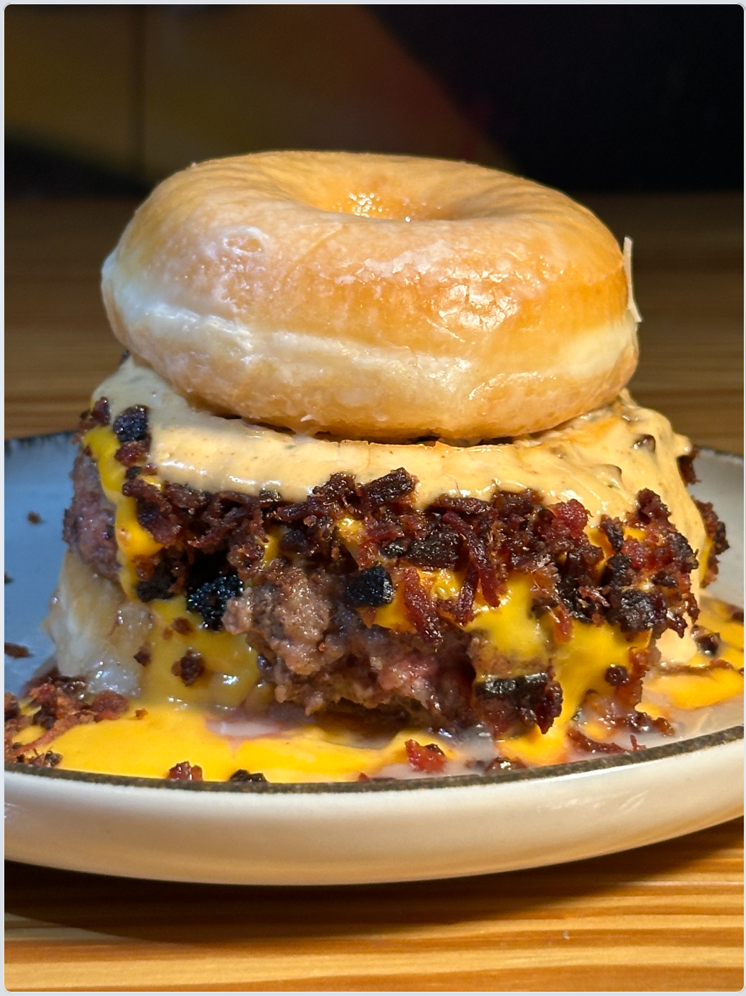 DOS Donut, Blend de vaca madurado, Cheddar derretido, Mayonesa American burger y Bits de bacon