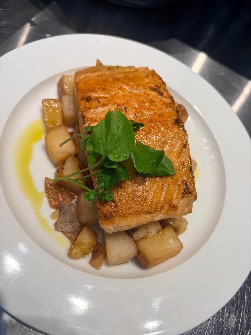 Preparado al momento, nuestro salmón se sirve jugoso y en su punto, acompañado de papas suaves con un toque de ciboulette que realza cada bocado.