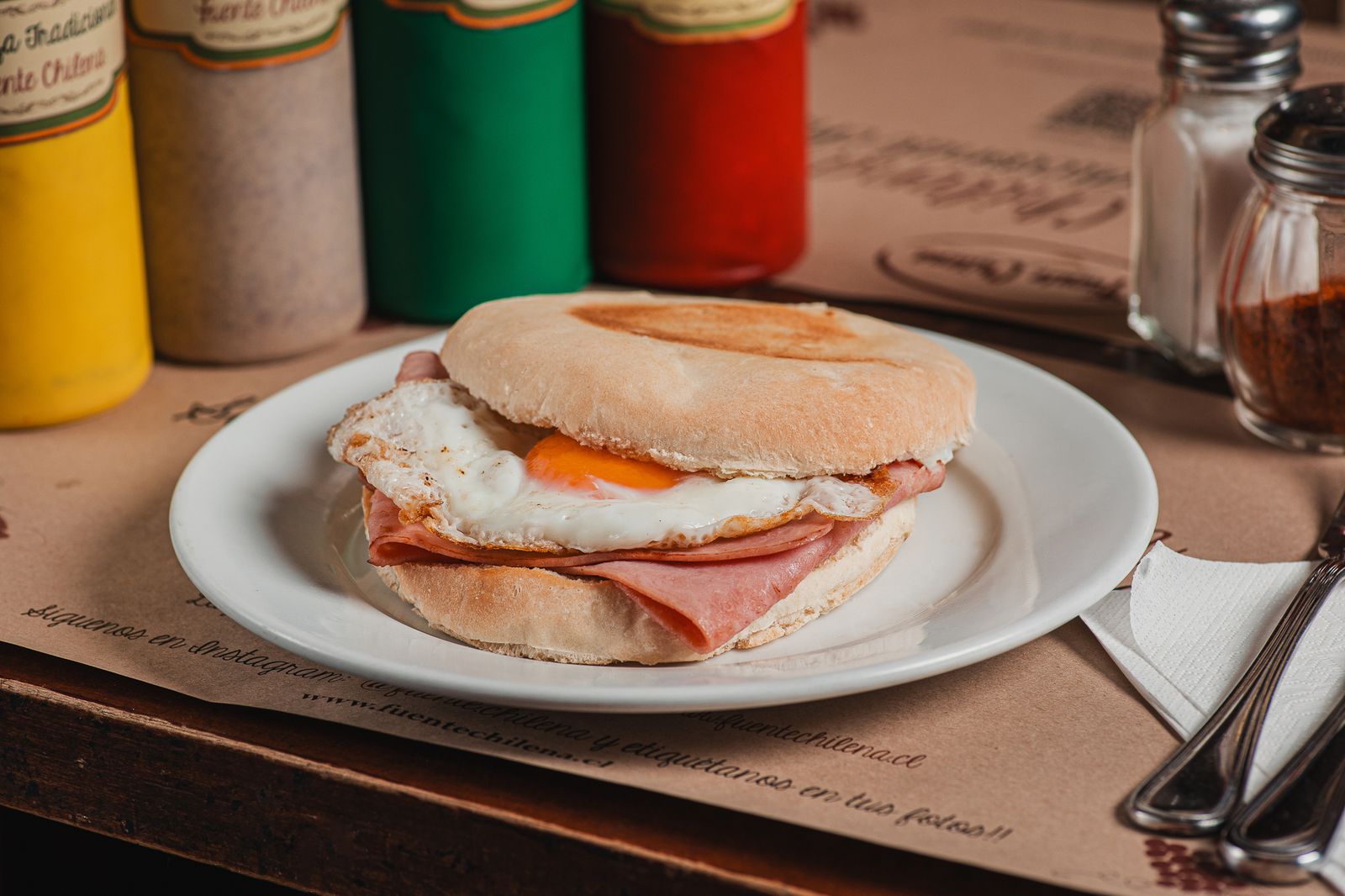 Jamón pierna dorado a la plancha más huevo frito, Jugo de frutas, Té o café
