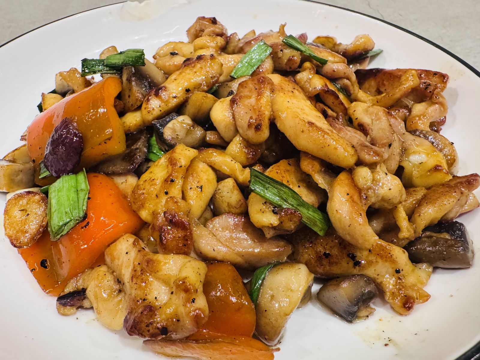 Pollo, champiñones, pimiento, ajo, cebollino chino