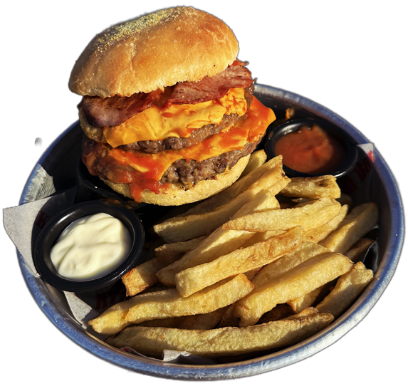 Medallón de carne, cheddar, panceta, salsa tasty y papas fritas