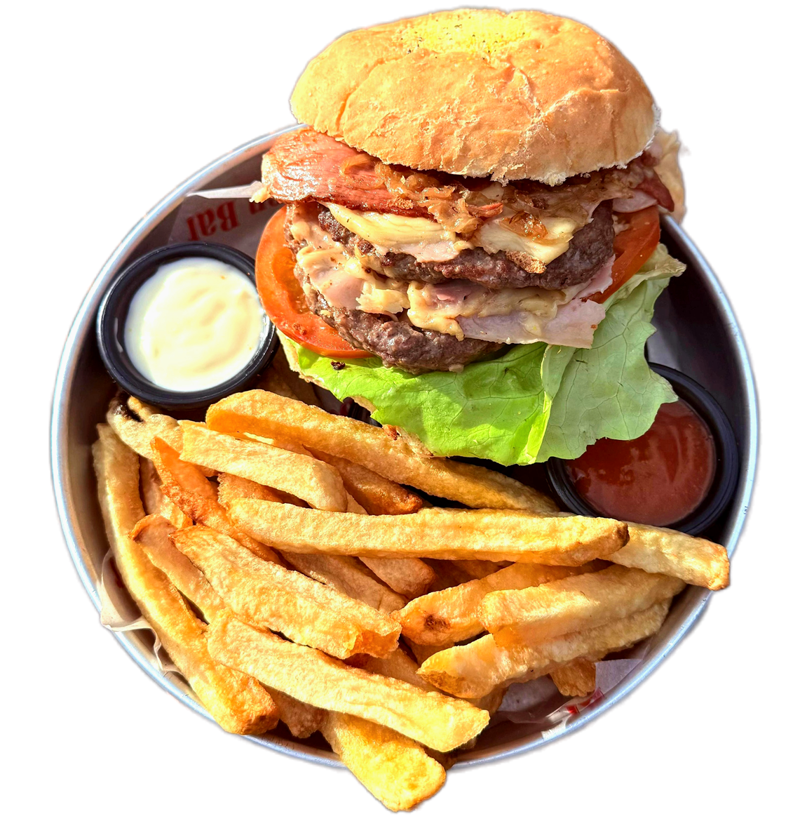 Medallón de carne, panceta, jamón, queso, lechuga, tomate, cebolla y papas fritas