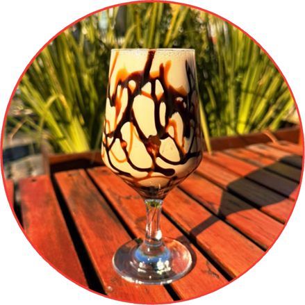 Espresso, baileys, salsa de chocolate, azúcar y hielo