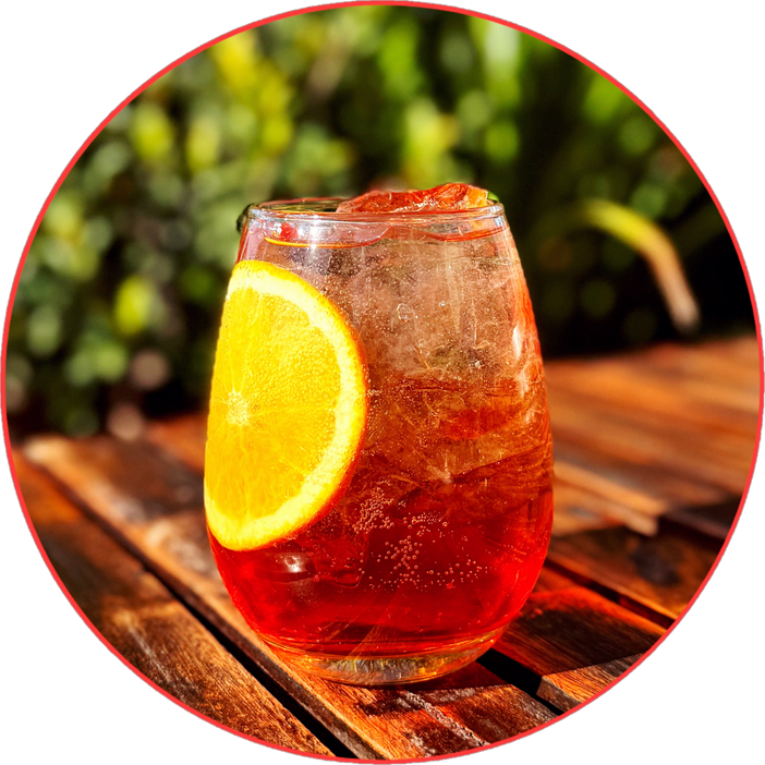 Aperol, hielo, espumante extra brut, rodaja de naranja y un dash de soda