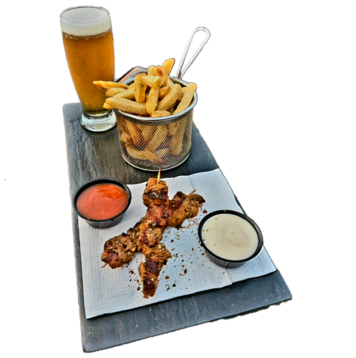 2 pinchos de cerdo + 1 chopp de cerveza 300 cm3 + papas fritas