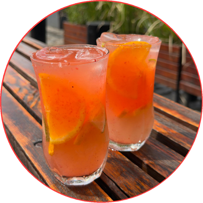 Tequila, almíbar, hielo, bebida saborizada de pomelo, zumo de limón y frutos rojos.