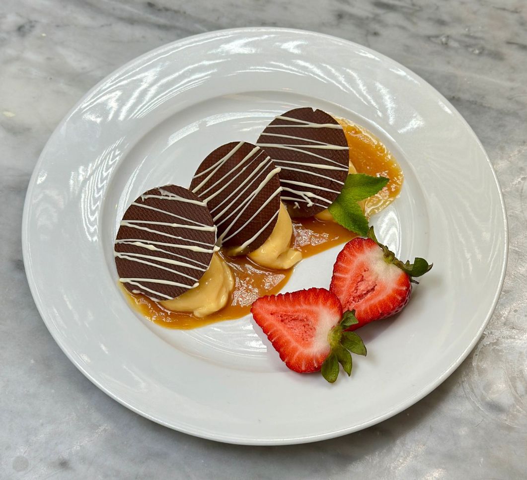 Discos de chocolate intercalados con quenelle frío de Crème Brûlée de vainilla con chocolate blanco; todo acompañado de una salsa toffee de maracuyá y naranjas confitadas.