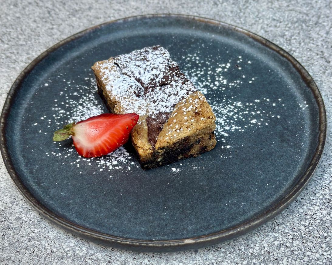 Brownie tibio de chocolate cubierto con una masa de galleta con toques de nueces y chips de chocolate, decorado con azúcar flor.