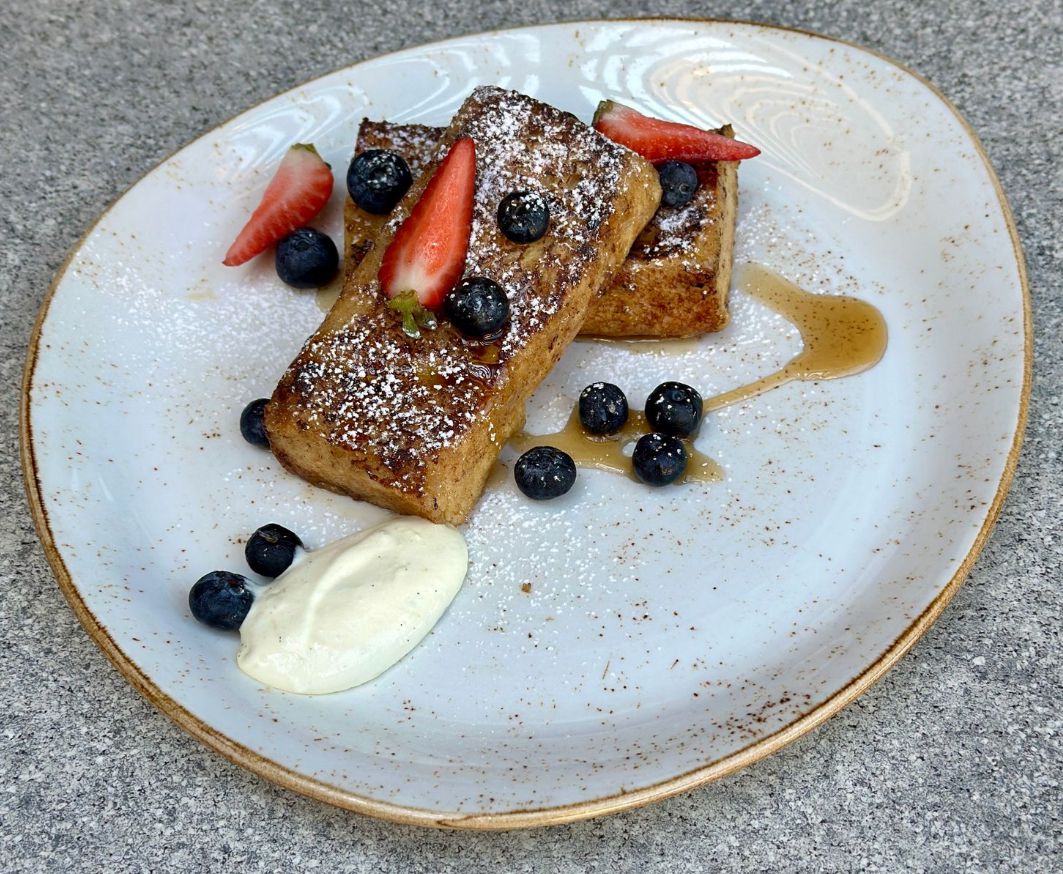 Tostadas de pan brioche remojadas en un baño de leche y canela, doradas en azúcar; cubiertas con arándanos, frutilla, syrup y crema chantilly saborizada.