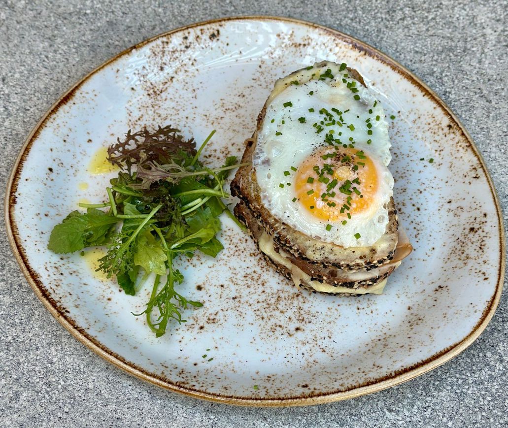Pan de masa madre integral con semillas de sésamo horneado relleno de salsa blanca, dúo de quesos (gruyere y mantecoso) fundidos y jamón acaramelado, coronado con huevo frito y ciboulette; acompañado de un mix de hojas verdes.
