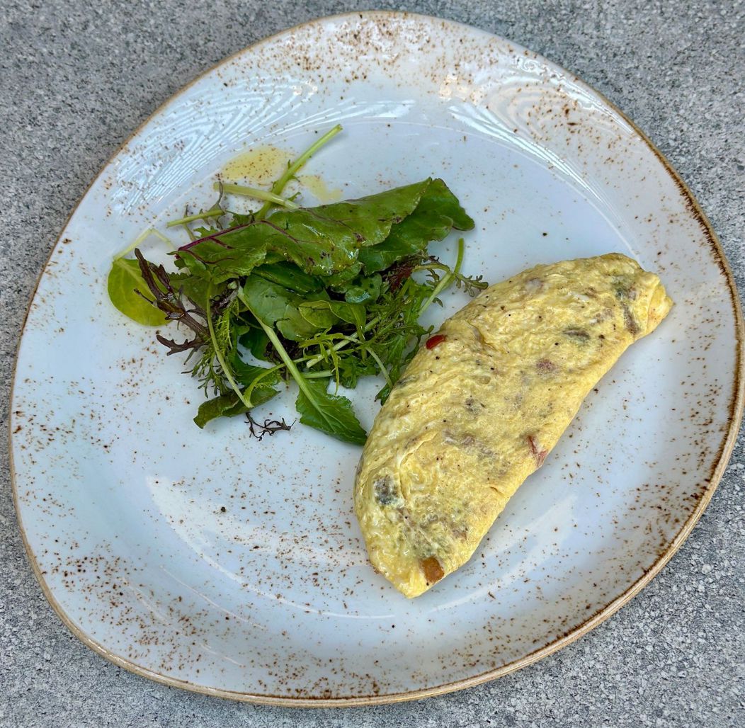 Omelette relleno de jamón acaramelado y tomate, acompañado de un mix de hojas verdes. Opción de incorporar polvo de setas y trufa por $900.