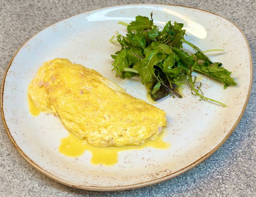 Omelette relleno de jamón acaramelado y queso fundido, acompañado de un mix de hojas verdes. Opción de incorporar polvo de setas y trufa por $900.