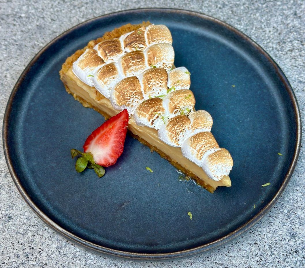 Clásico pie de limón con base de galleta y crumble de almendras, relleno con una mezcla de limón y leche condensada, cubierto de merengue italiano.