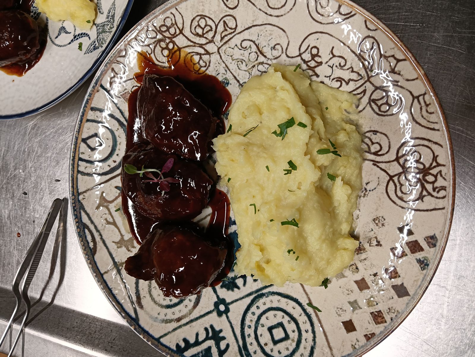 Carrilleras con salsa de fresas y reducción al brandy y puré de patata