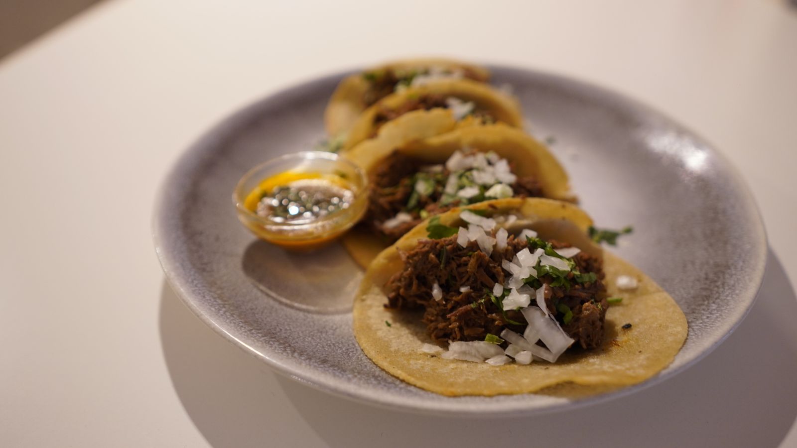 Carne de Birria en salsa , cebolla blanca y cilantro Tortilla de maiz Azul (+3€)