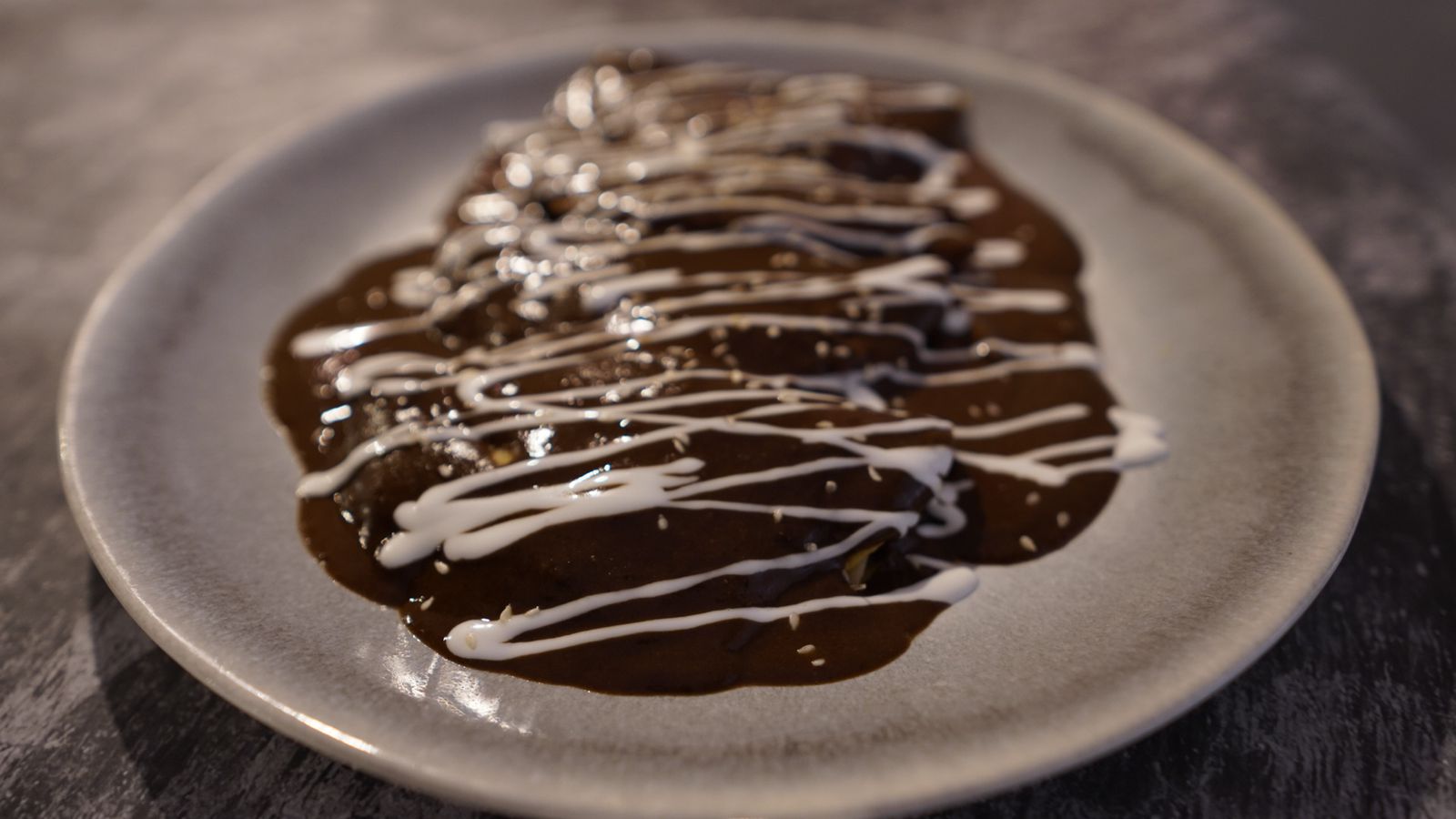 Tortilla de maiz rellenas de pollo con salsa de mole ,nata y sesamo