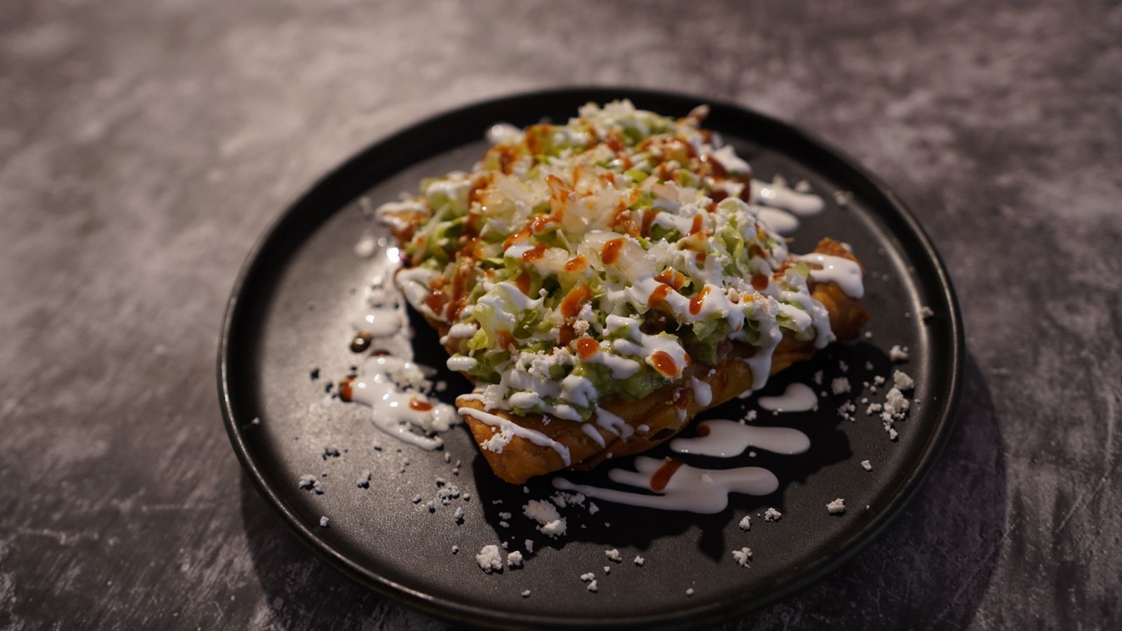 Tortilla de maiz , queso , crema nata ,guacamole , chiplotle , lechuga y rellenas de pollo