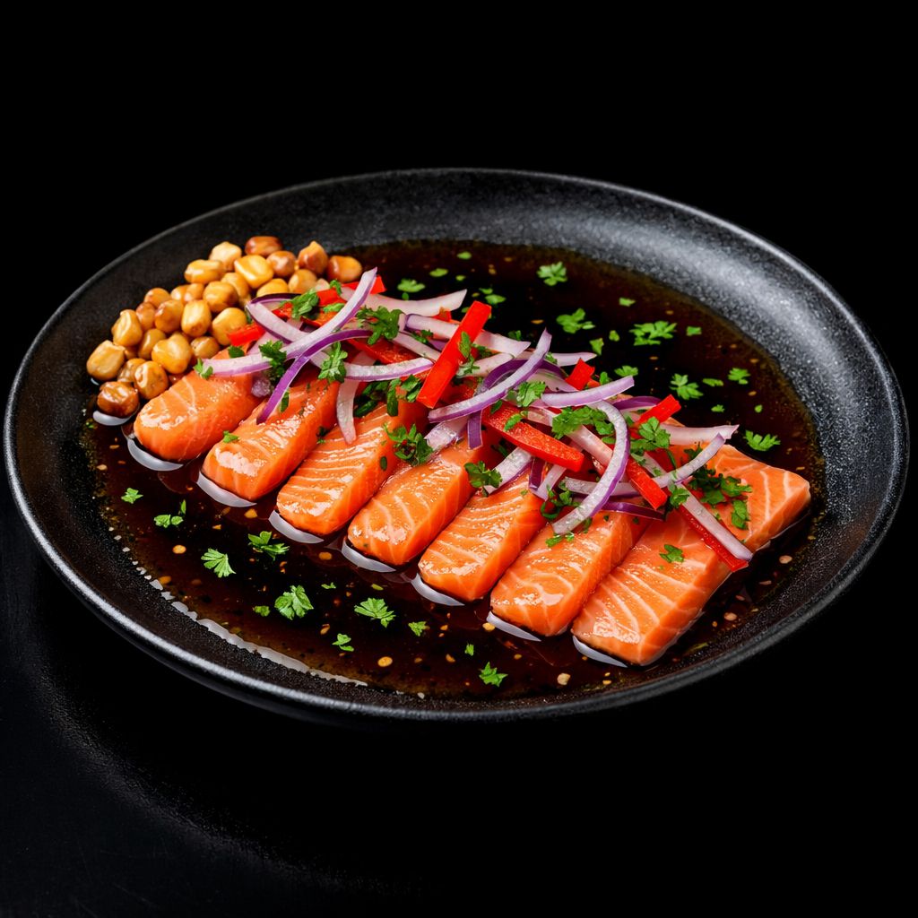 9 finos cortes de salmón acompañados de canchita, pimentón rojo en juliana, cebolla morada en pluma y cilantro en lluvia, marinado en salsa ponzu.