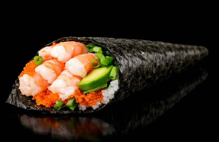 Cono tradicional japonés , relleno de Camarón, masago, palta y cebollín.