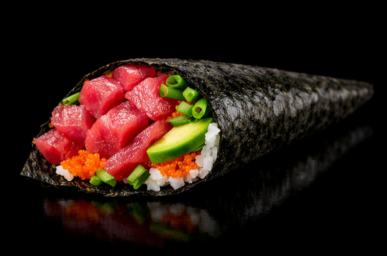 Cono tradicional japonés , relleno de Atún, masago, palta y cebollín.