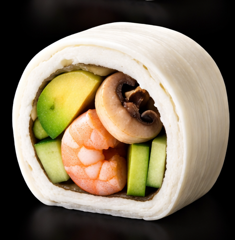 Camarón cocido, palta, champiñón, pepino, envuelto en alga nori estilo oriental y plaqueta de queso crema.