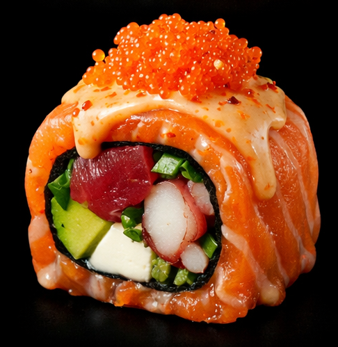 Pulpo, atún, queso crema, palta y ciboullete, envuelto en salmón bañado en salsa acevichada spicy y topping de masago.