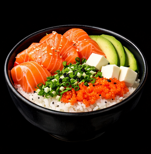 Salmón, queso crema, palta, masago, cebollín y sésamo.