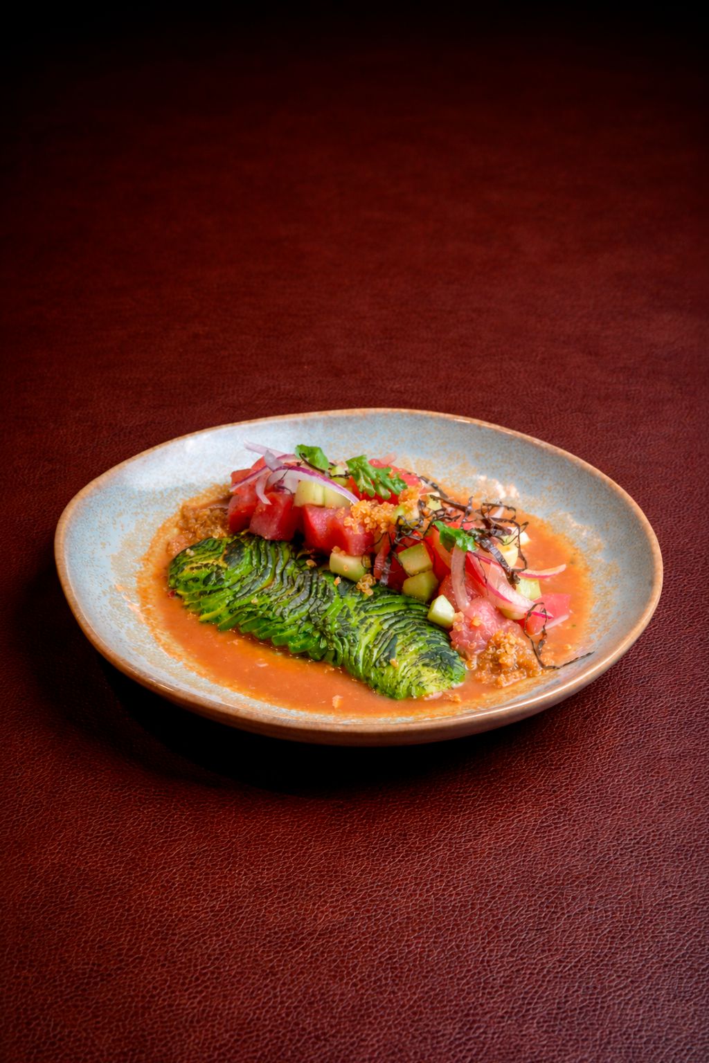 Dados de atún de aleta amarilla, palta tatemada, cebolla morada y pepino, aderezados con leche de tigre nikkei