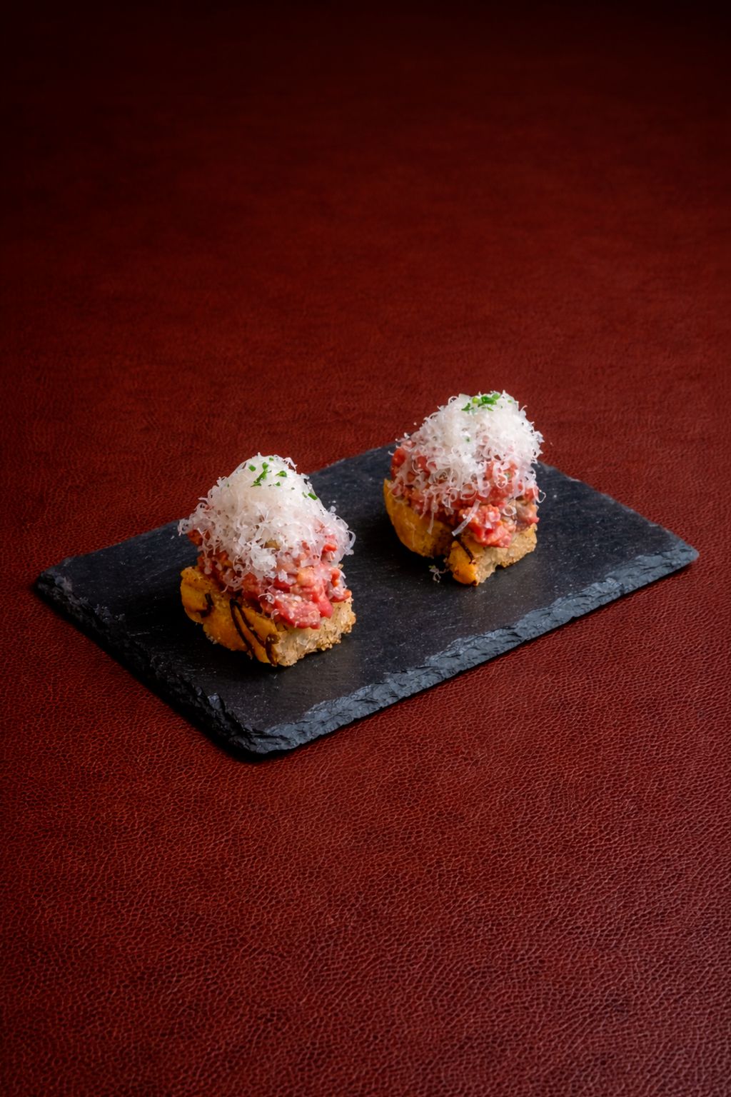 Bruschetta con tartar de filete de res y aceite de trufa, terminado con queso Grana Padano
