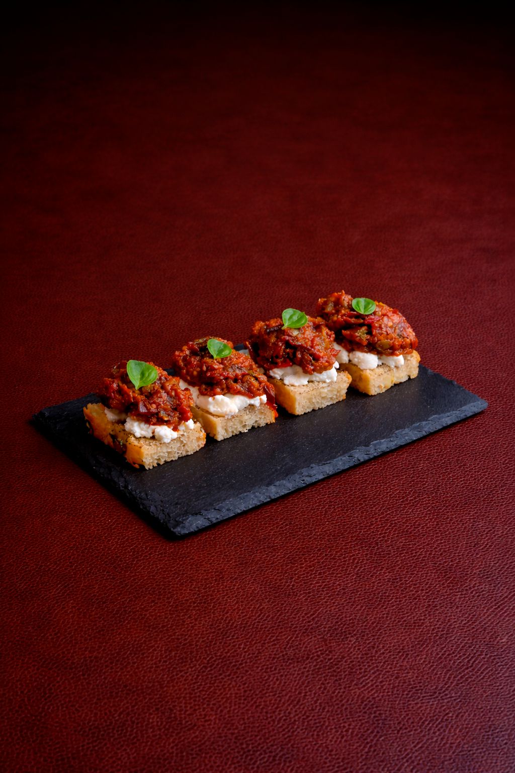 Burschetta en focaccia de la casa, con base de ricotta y caponata